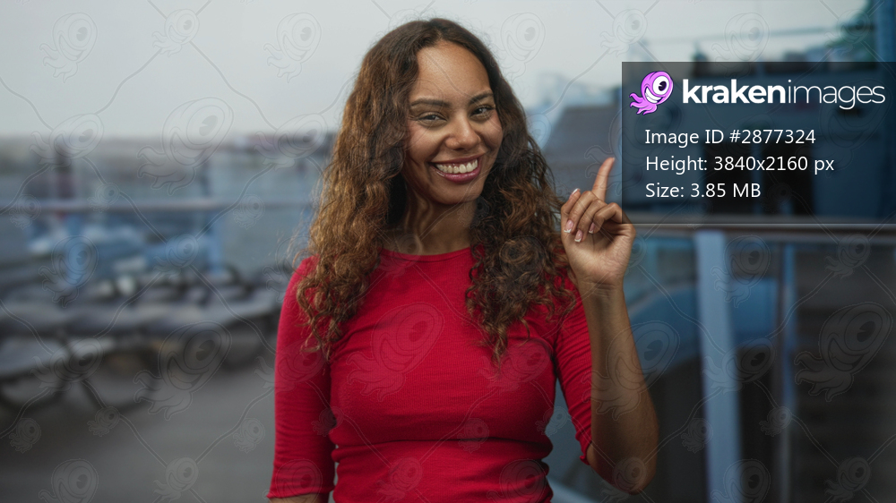 Woman points finger to temple on cruise ship deck wearing red top and smiling at camera; idea thinking playful.