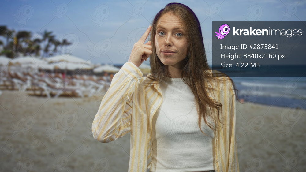 Woman points finger to temple on street by the beach in casual white crop top and yellow striped shirt, seaside umbrellas visible; thoughtful reflection. - Kraken Images