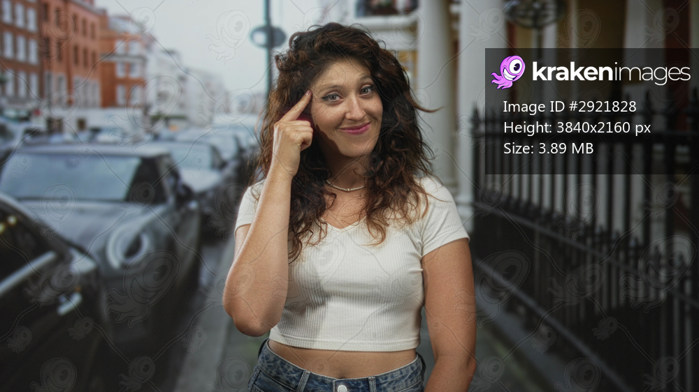 Woman points finger to temple on street, smiles wearing white crop top and jeans; playful curiosity confidence.