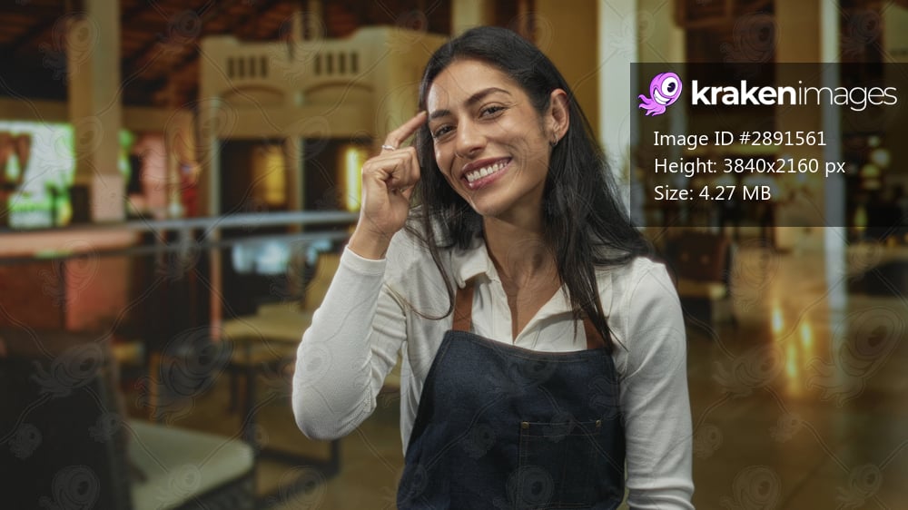 Woman points finger to temple and smiles while wearing apron in hotel building lobby; confidence cleverness.