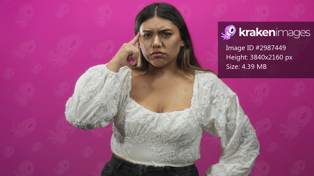 Woman points finger to temple with stern frown and furrowed brow, white embroidered blouse visible against pink studio backdrop; frustration thinking.