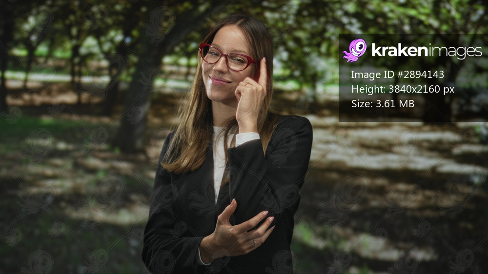 Woman points finger to temple wearing red glasses and black blazer in forest; idea thinking confidence.