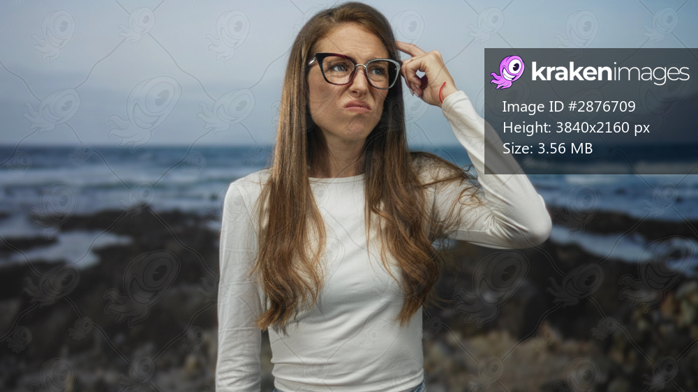 Woman points finger to temple while adjusting glasses on rocky seaside coast near waves, outdoors; puzzled thought.