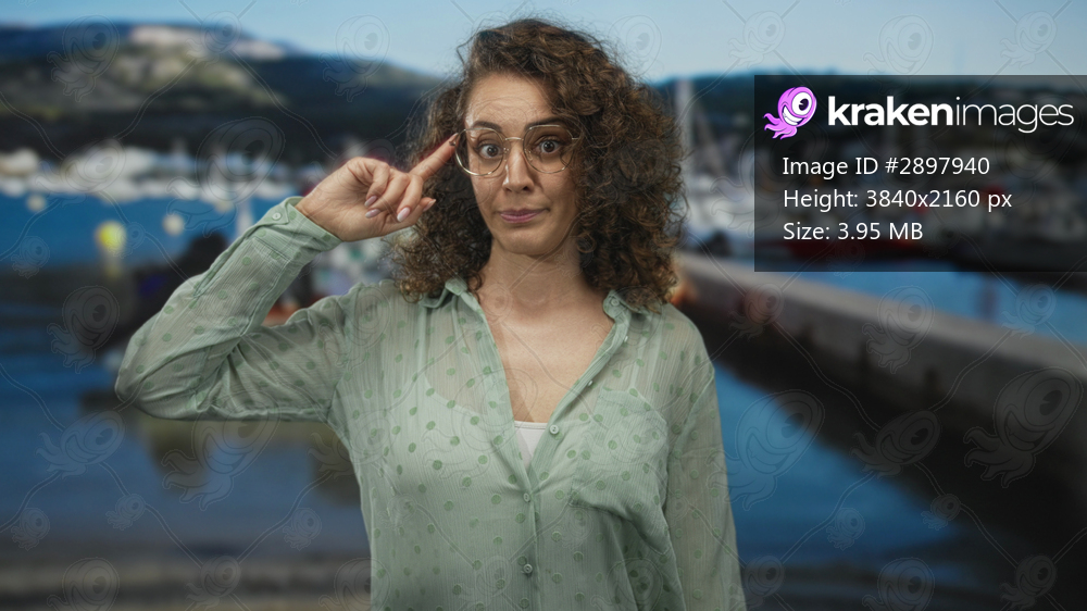 Woman points finger to temple while wearing glasses and sheer green blouse at port street with boats on a pier; skepticism questioning.
