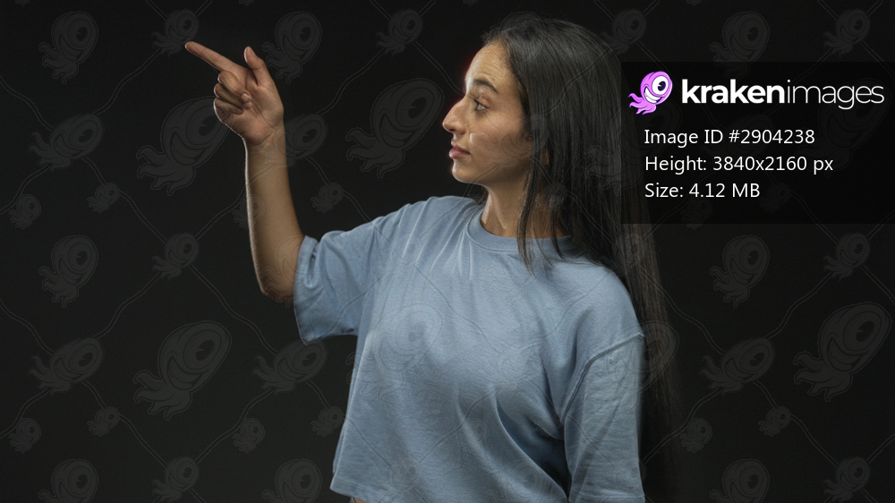 Woman points finger to the left in studio with black backdrop wearing blue shirt and slight smile; confidence.