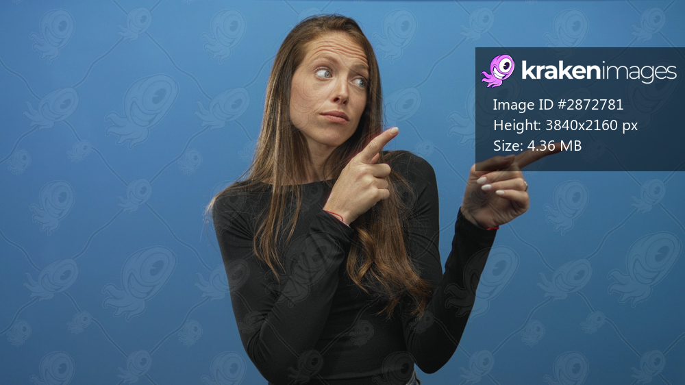 Woman points finger to the right in a blue studio while wearing a black top and pointing with both hands; doubt choice direction.