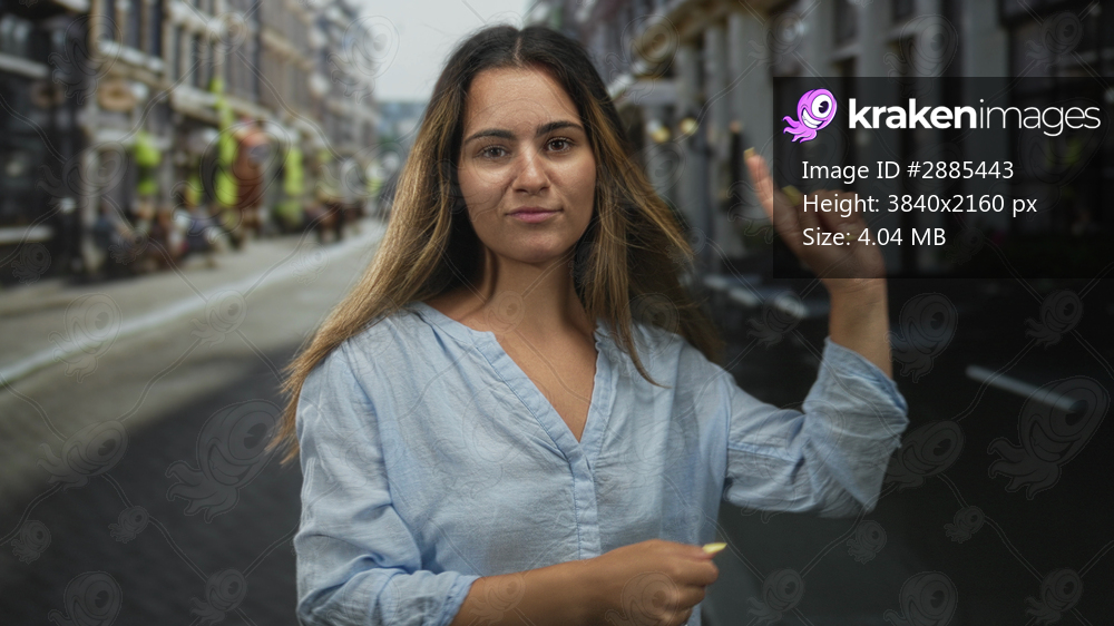 Woman points finger to the right on a cobblestone street in a city, blue shirt and yellow nails visible; confidence urban.