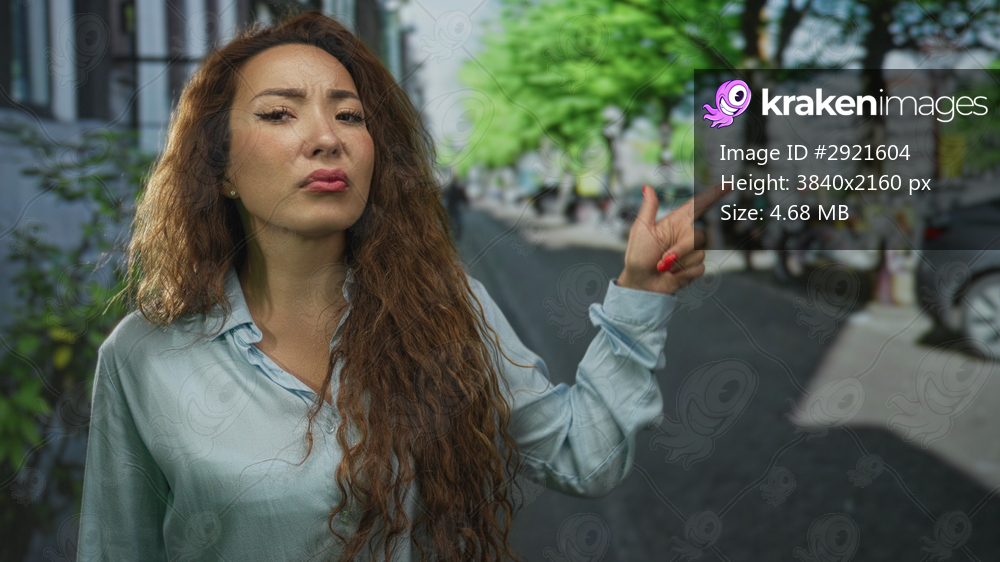 Woman points finger to the right on street wearing light blue shirt with skeptical expression; frustration.
