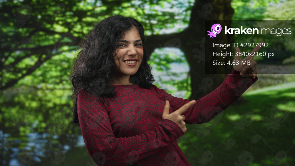 Woman points finger to the side in a park near green trees and a pond, smiling with both hands forming finger guns while wearing a red sweater; confidence. - Kraken Images