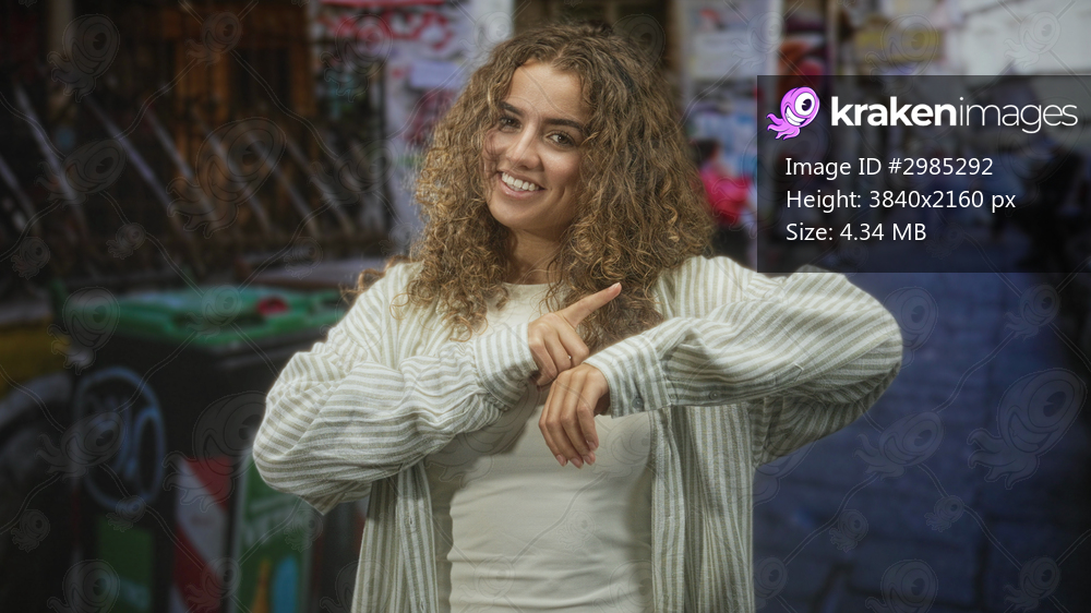 Woman points finger to wrist beside a trash bin on a street, smiling and checking time; playful confidence.