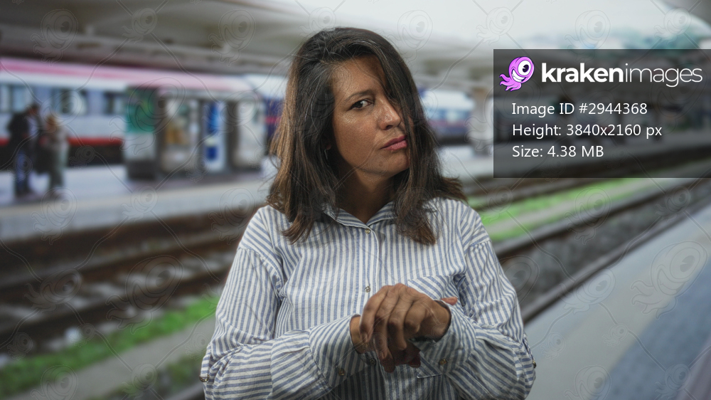 Woman points finger to wrist beside train tracks at station building platform; impatience waiting commute.