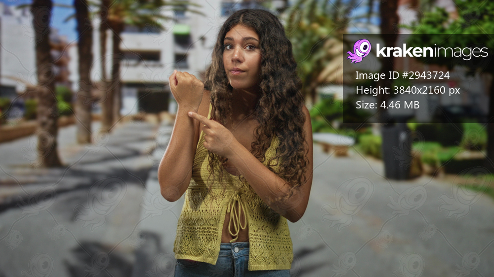 Woman points finger to wrist on a sunlit street showing bare forearm and yellow crochet top while looking concerned and slightly puzzled; concern.