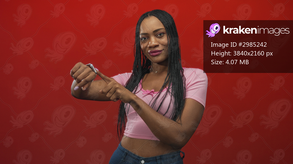 Woman points finger to wrist wearing pink crop top in studio with red backdrop; confidence reminder.