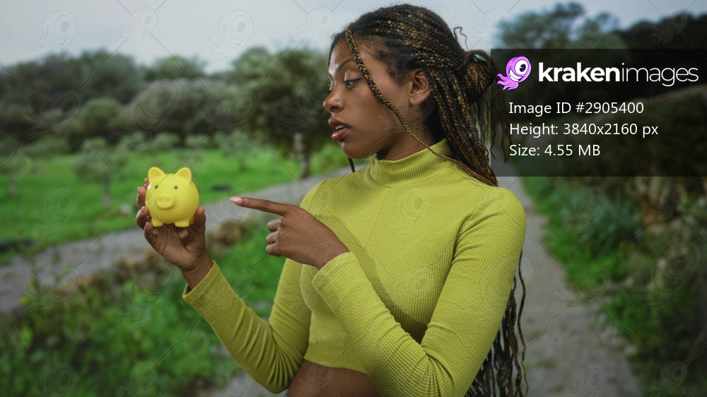 Woman points finger to yellow piggybank while holding it in field beside stone path wearing green turtleneck sweater; saving money hopeful.