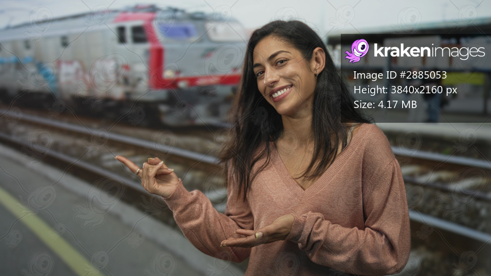 Woman points finger toward a passing train at a train station while presenting an open palm; casual travel amused.
