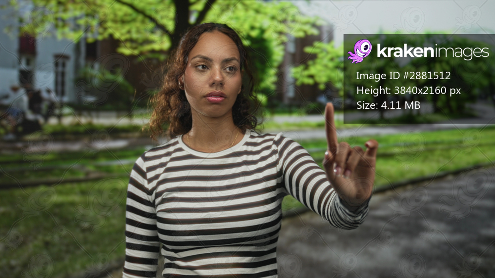Woman points finger toward camera by a building in a leafy park, striped shirt and outstretched hand prominent; quiet determination.