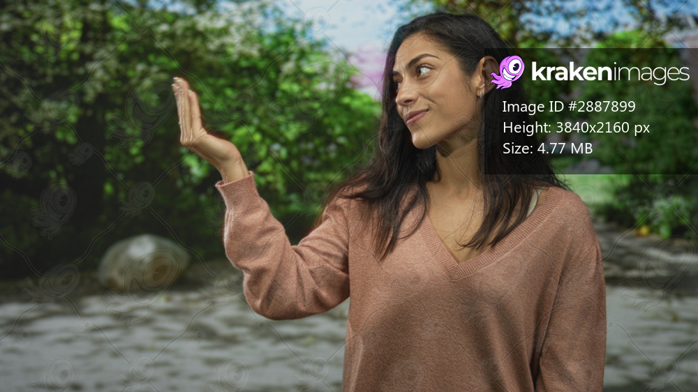 Woman points finger toward camera in forest path with bare hand and a relaxed smile; playful confidence.
