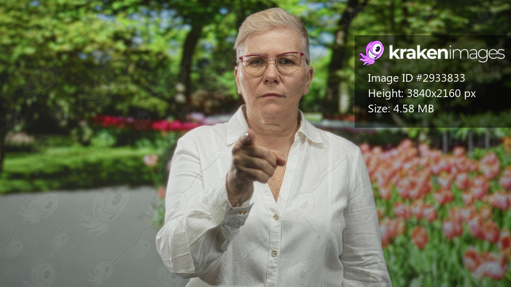Woman points finger toward camera in forest setting beside tulip beds wearing glasses and white shirt; authority.