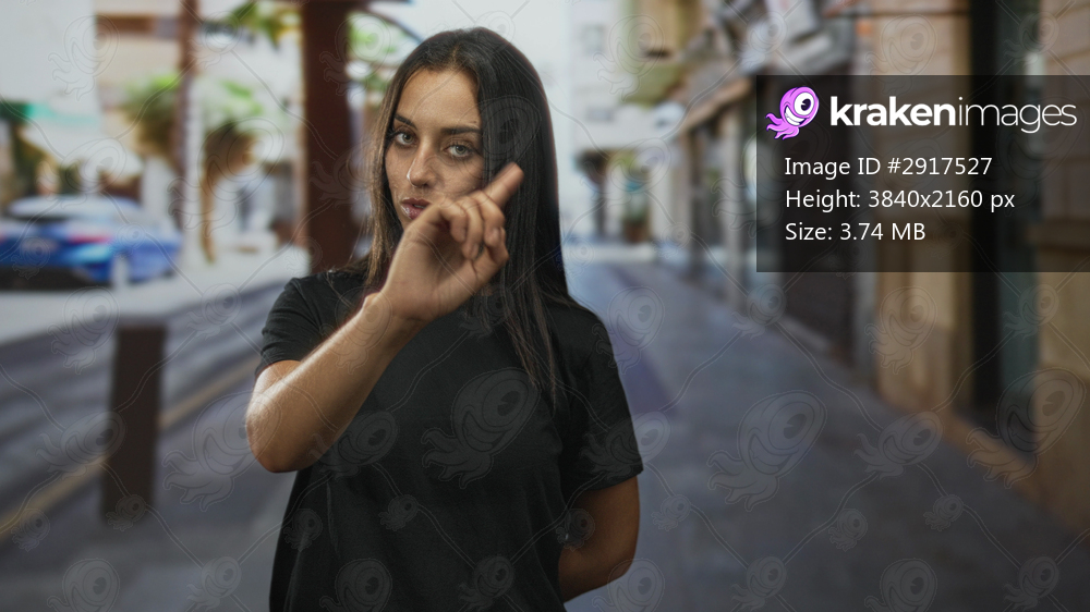 Woman points finger toward camera on a narrow city street, bare hand raised and casual black t shirt visible; contemplation.