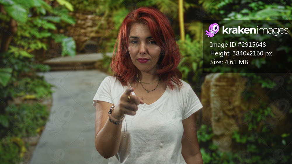 Woman points finger toward foreground on a forest path wearing white t shirt and necklaces, forward stance and serious expression; assertion.