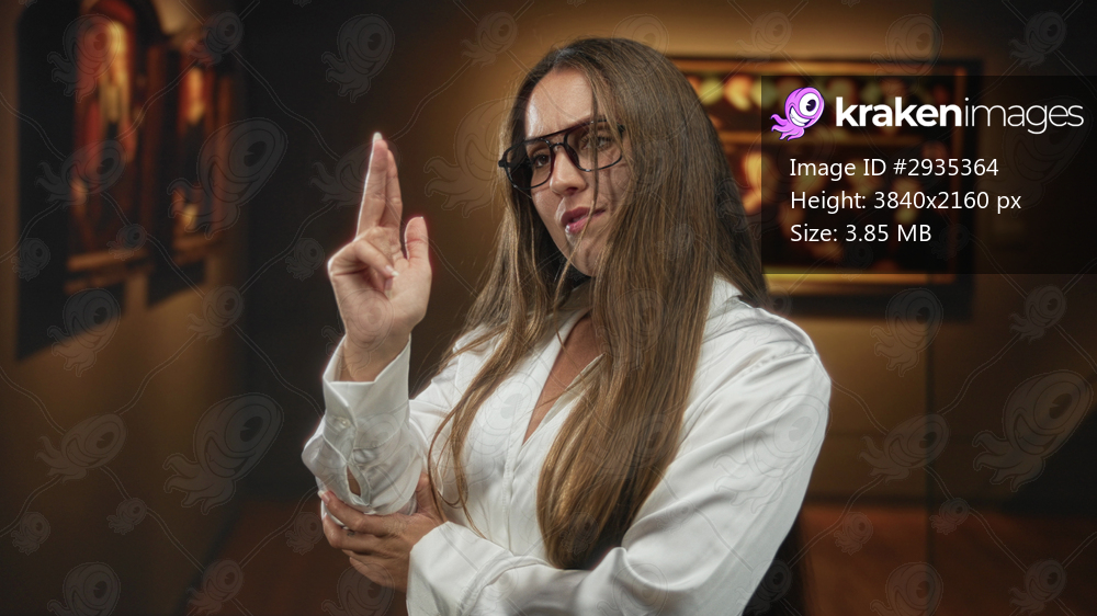 Woman points finger toward painting in gallery building while wearing glasses and white shirt; art critique curiosity.