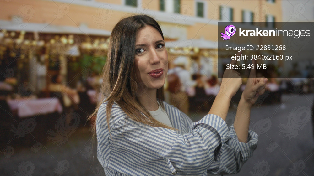 Woman points finger toward tables on terrace of street restaurant, lips parted in animated pose; surprise.