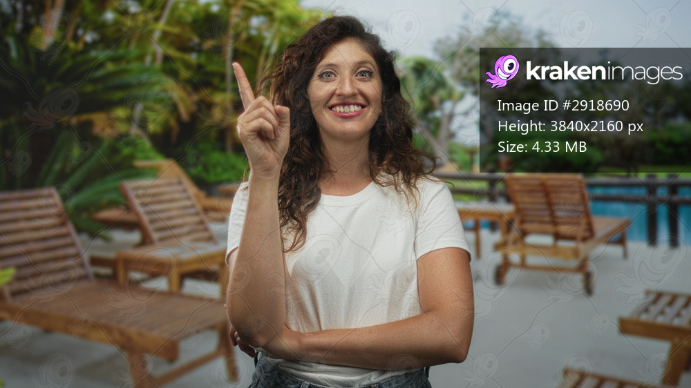 Woman points finger up at hotel poolside resort near wooden loungers, smiling with arms crossed and visible bare forearm; excitement discovery.