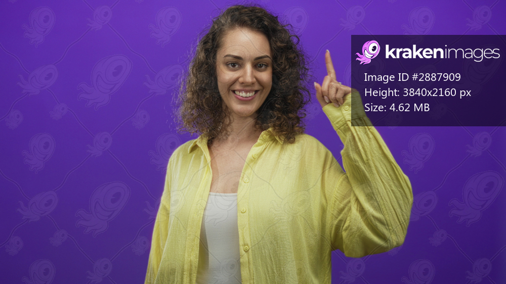 Woman points finger up in studio against purple wall, young hispanic smiling in yellow shirt and white tank; confidence optimism.