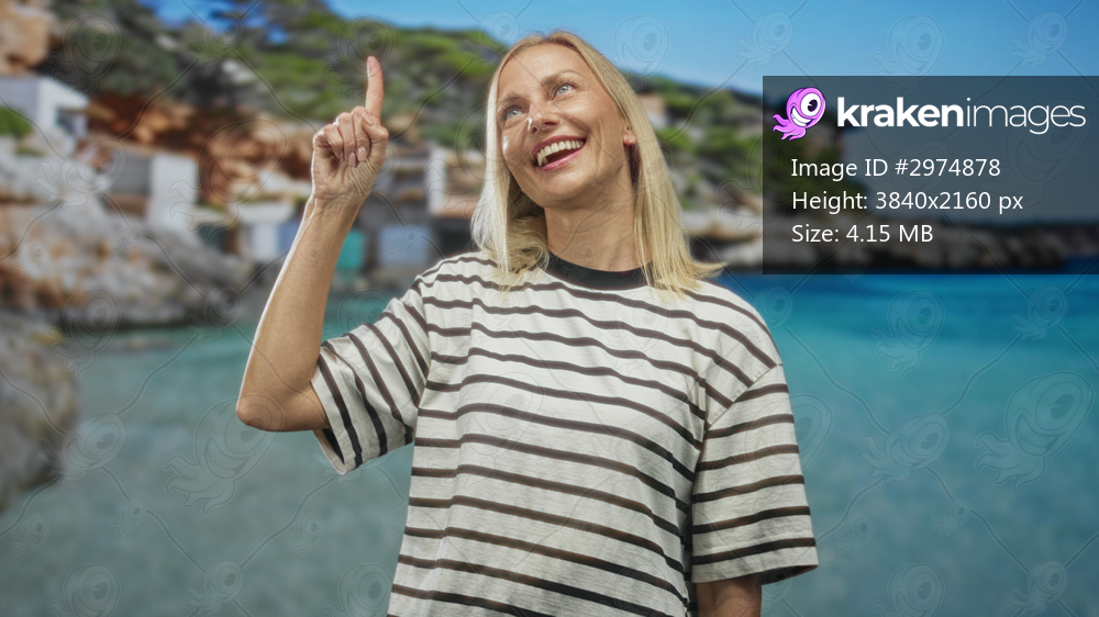 Woman points finger up in studio wearing striped shirt and smiling at upper right; optimism discovery.
