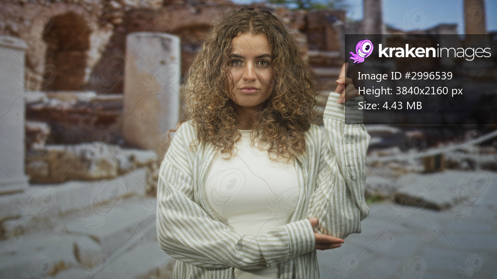 Woman points finger up with left hand supporting her elbow, curly hair and white shirt visible in front of ancient ruins building; exploration confidence. - Kraken Images
