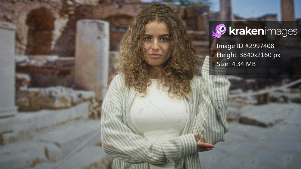 Woman points finger up with left hand supporting her elbow, curly hair and white shirt visible in front of ancient ruins building; exploration confidence. - Kraken Images