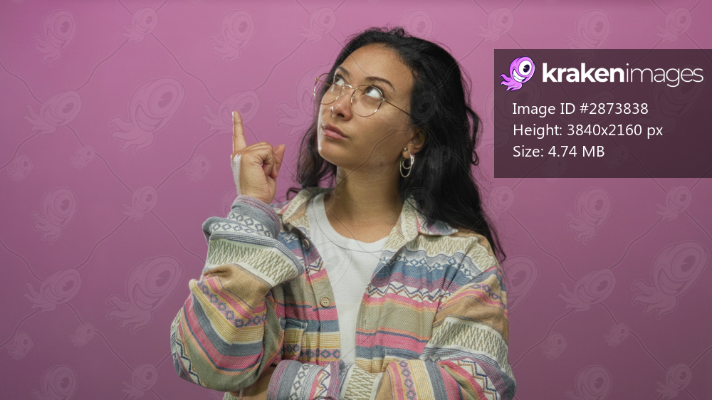 Woman points finger up and looks up in a pink studio, wearing round glasses and patterned jacket over a white tee; curiosity.