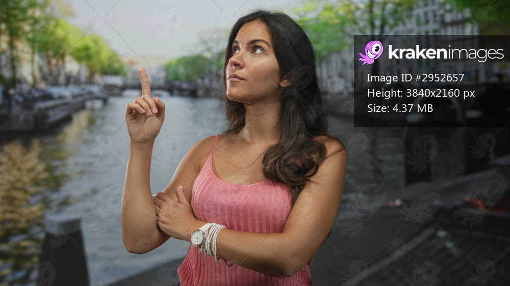 Woman points finger up on street by an amsterdam canal with hand on arm and exposed shoulder; curiosity exploration.