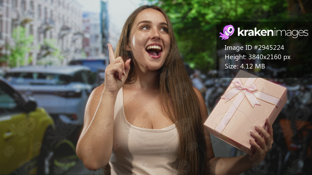 Woman points finger up with smiling face holding pink gift box showing bare breast on street; celebration joy.