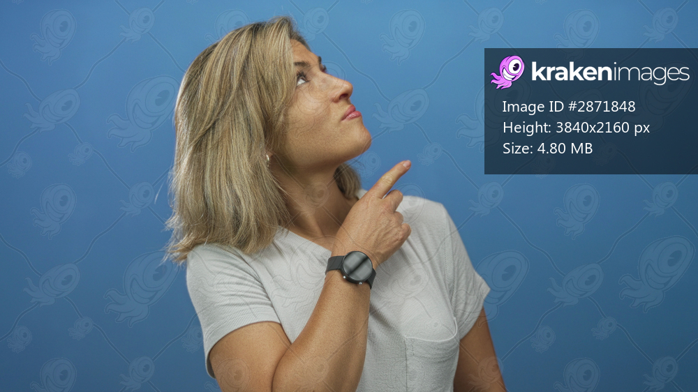 Woman points finger upward at empty space in a bright blue studio, showing bare hand gesture beside her face; curiosity.