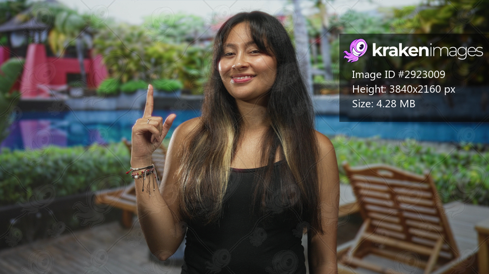 Woman points finger upward at hotel pool deck, smiling with eyes closed and long brunette hair in black tank top; serenity.