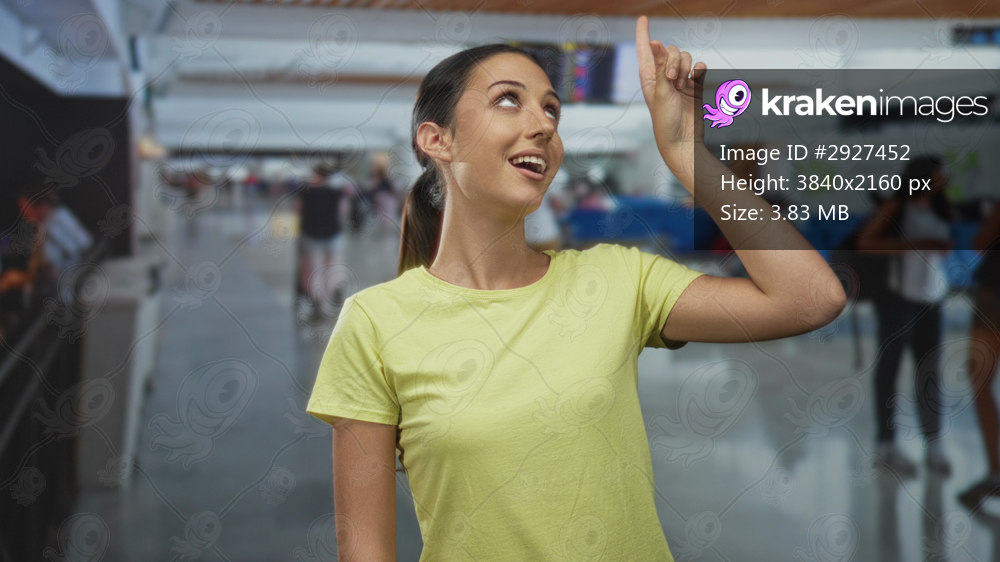 Woman points finger upward with bare hand in airport terminal while smiling and looking up at overhead area; playful curiosity.