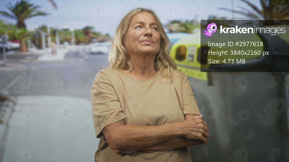 Woman points finger upward beside a yellow recycling bin on a street with arms crossed and a slight smile; thoughtful reflection.