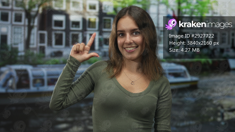 Woman points finger upward beside canal boat on amsterdam street with narrow buildings, wearing green top and heart necklace, smiling at camera; friendly happiness. - Kraken Images