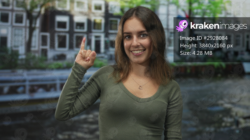 Woman points finger upward beside canal boat on amsterdam street with narrow buildings, wearing green top and heart necklace, smiling at camera; friendly happiness. - Kraken Images