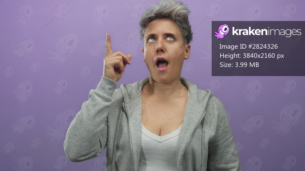 Woman points finger upward and closes eyes with parted lips in studio against purple background; confidence.