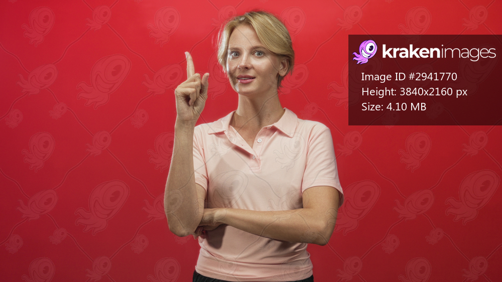 Woman points finger upward with folded arm in studio red wall, index finger raised as gesture; confidence assertion.