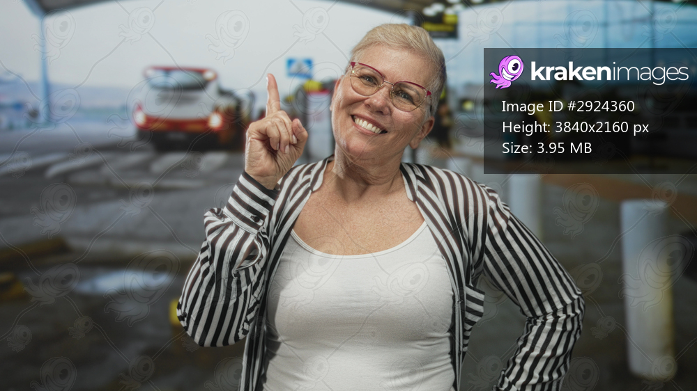 Woman points finger upward in airport terminal while smiling broadly, wearing striped shirt and glasses; confidence travel tip.