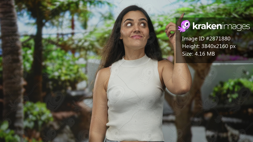 Woman points finger upward in forest park scene sleeveless top and bare hand visible; curiosity serenity.