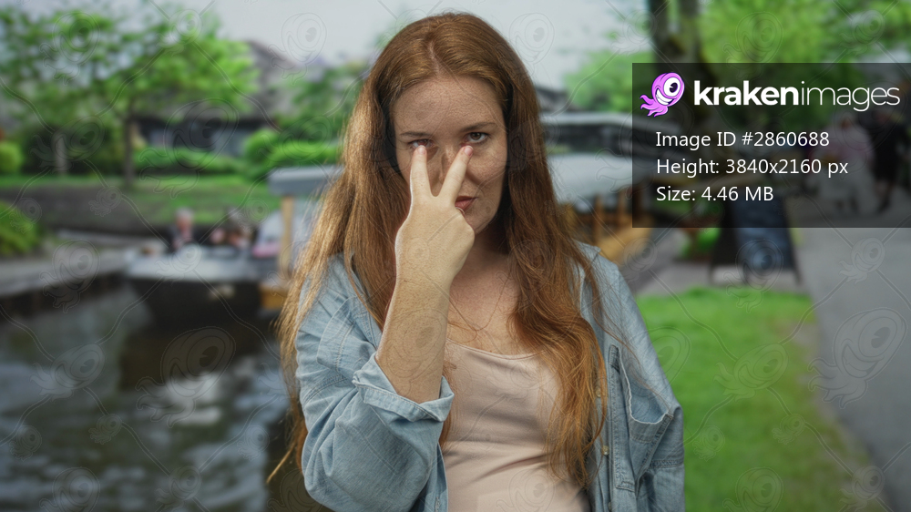Woman points finger upward in green leafy urban park by a water canal under diffuse daylight; curiosity.