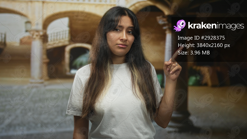 Woman points finger upward in old town building courtyard, white t shirt and lip piercing visible; skepticism caution.
