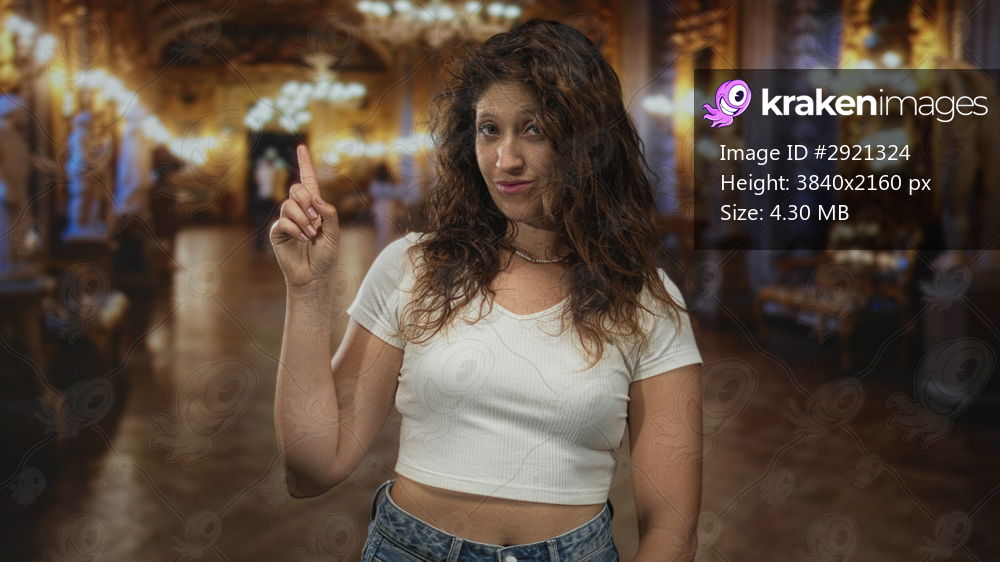 Woman points finger upward in ornate museum building, wearing white crop top and jeans revealing midriff and raised finger gesture; wry amusement curiosity. - Kraken Images