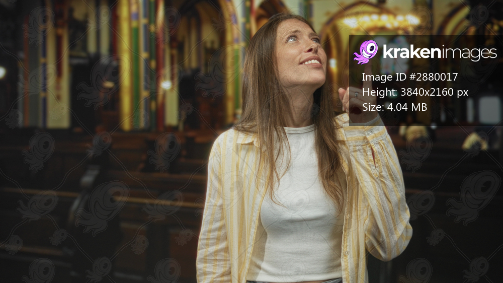 Woman points finger upward inside a catholic church looking up toward stained glass and wooden pews, smiling in a striped shirt; faith.