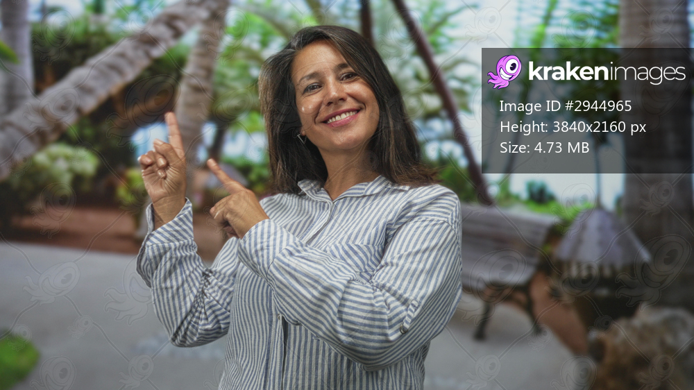Woman points finger upward near a bench and palm trees on a street, smiling with closed eyes and relaxed pose; joyful confidence.
