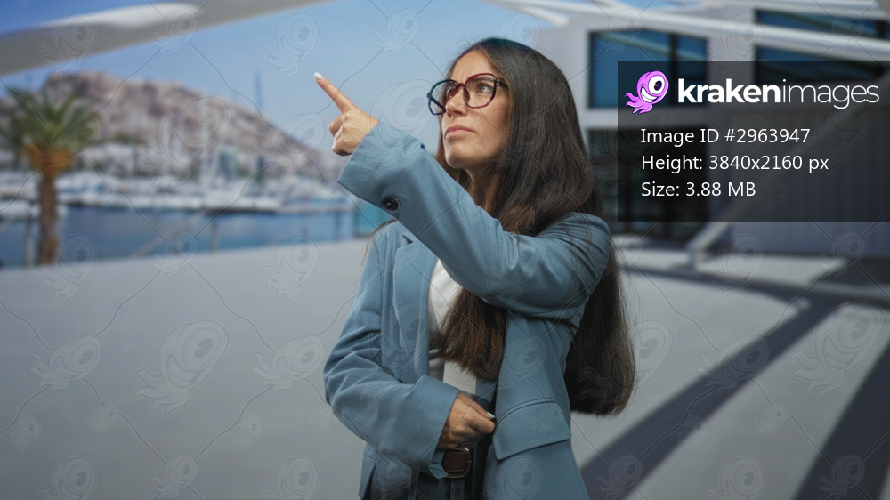 Woman points finger upward near modern building entrance while holding belt strap; confidence aspiration.